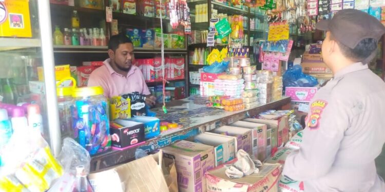LHOKSEUMAWE – Personel Polsek Sawang mengecek stabilitas stok sembako di sejumlah kedai kelontong di Kecamatan Sawang, Aceh Utara, wilayah hukum Polres Lhokseumawe, Kamis (2/2/2023).