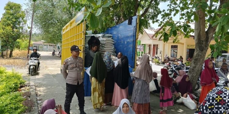 LHOKSEUMAWE – Personel Polsek Sawang melakukan pengamanan penyaluran bantuan pangan Beras Cadangan Pemerintah (BCP) tahap I tahun 2023 di kantor Kecamatan Sawang, Aceh Utara, wilayah hukum Polres Lhokseumawe, Minggu (16/4/2023).
