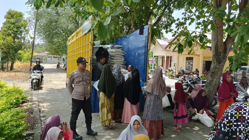 LHOKSEUMAWE – Personel Polsek Sawang melakukan pengamanan penyaluran bantuan pangan Beras Cadangan Pemerintah (BCP) tahap I tahun 2023 di kantor Kecamatan Sawang, Aceh Utara, wilayah hukum Polres Lhokseumawe, Minggu (16/4/2023).