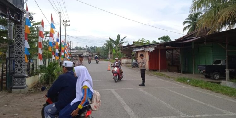 melaksanakan strong poin atau pengaturan lalu lintas di Simpang Jalan Pendidikan, Sawang, Aceh Utara, wilayah hukum Polres Lhokseumawe, Rabu (22/2/2023) pagi.