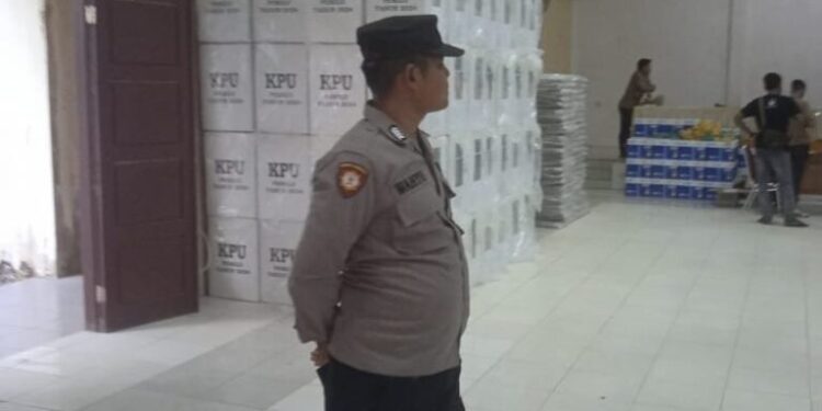 LHOKSEUMAWE – Personel Polsek Sawang melaksanakan pengawalan dan pengamanan logistik pemilu di sekretariat PPK Sawang, Aceh Utara, wilayah hukum Polres Lhokseumawe, Sabtu (10/2/2024).