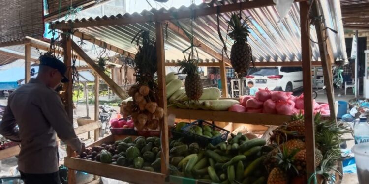 LHOKSEUMAWE – Personel Polsek Simpang Keuramat mengecek stok sembako pasca Hari Raya Idul Adha 1444 H ke sejumlah pedagang di pasar Keude Simpang Empat, Simpang Keuramat, Aceh Utara, wilayah hukum Polres Lhokseumawe, Minggu (2/7/2023).