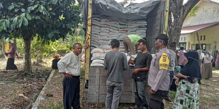 LHOKSEUMAWE – Personel Polsek Simpang Keuramat melakukan pengawalan dan pengamanan pada penyaluran bantuan pangan Beras Cadangan Pemerintah (BCP) Tahap II di kantor Kecamatan Simpang Keuramat, Aceh Utara, wilayah hukum Polres Lhokseumawe, Rabu (17/5/2023).