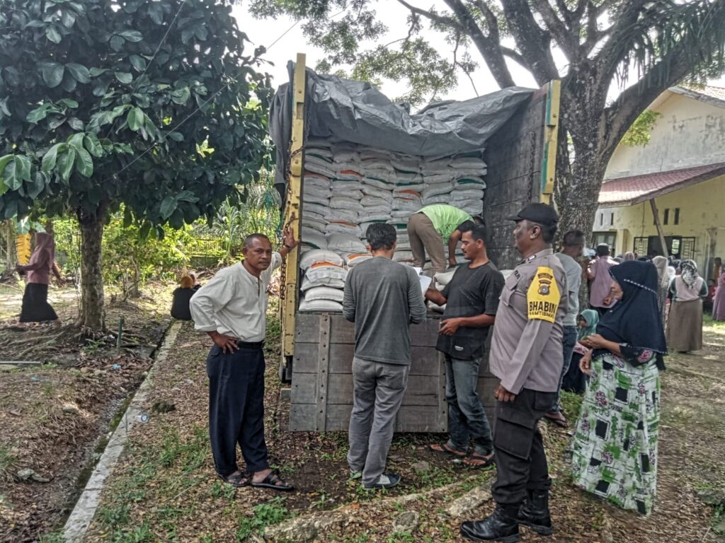 LHOKSEUMAWE – Personel Polsek Simpang Keuramat melakukan pengawalan dan pengamanan pada penyaluran bantuan pangan Beras Cadangan Pemerintah (BCP) Tahap II di kantor Kecamatan Simpang Keuramat, Aceh Utara, wilayah hukum Polres Lhokseumawe, Rabu (17/5/2023).