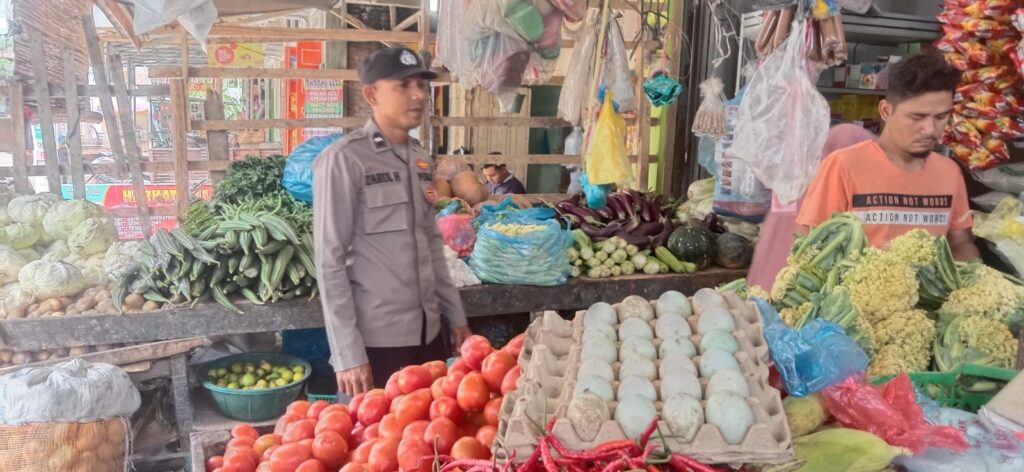 Pantauan di lapangan, personel menyambagi sejumlah pedagang untuk memastikan ketersediaan barang kebutuhan pokok masyarakat di pasar tersebut tetap stabil.