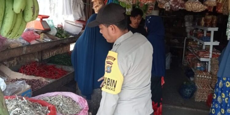 LHOKSEUMAWE – Personel Polsek Simpang Keuramat melakukan patroli dan monitoring stok sembako di pasar Keude Simpang Empat, Simpang Keuramat, Aceh Utara, wilayah hukum Polres Lhokseumawe, Kamis (8/2/2024).