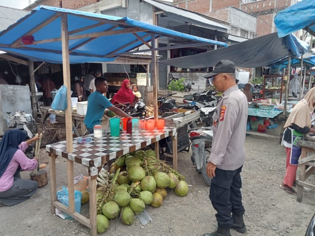LHOKSEUMAWE – Personel Polsek Simpang Keuramat melaksanakan strong poin jelang buka puasa di Keude Simpang Empat, Kecamatan Simpang Keuramat, Aceh Utara, wilayah hukum Polres Lhokseumawe, Minggu (2/4/2023) sore.
