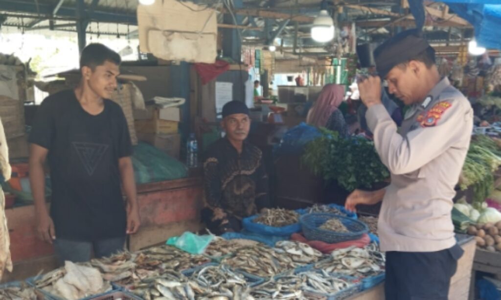 LHOKSEUMAWE – Personel Polsek Syamtalira Bayu kembali memantau persediaan sembako di pasar tradisional di Keude Bayu, Aceh Utara, wilayah hukum Polres Lhokseumawe, Minggu (28/5/2023).