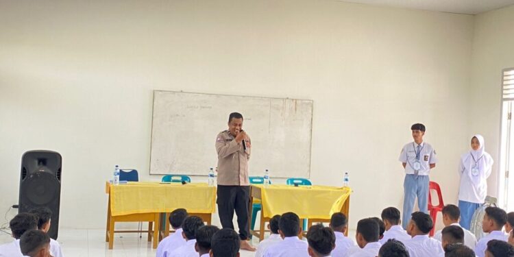 LHOKSEUMAWE -Personel Polsek Syamtalira Bayu melaksanakan sosialisasi bahaya Narkoba dan kenakalan remaja di SMA Negeri 1 Syamtalira Bayu, Aceh Utara, wilayah hukum Polres Lhokseumawe, Selasa (18/7/2023).