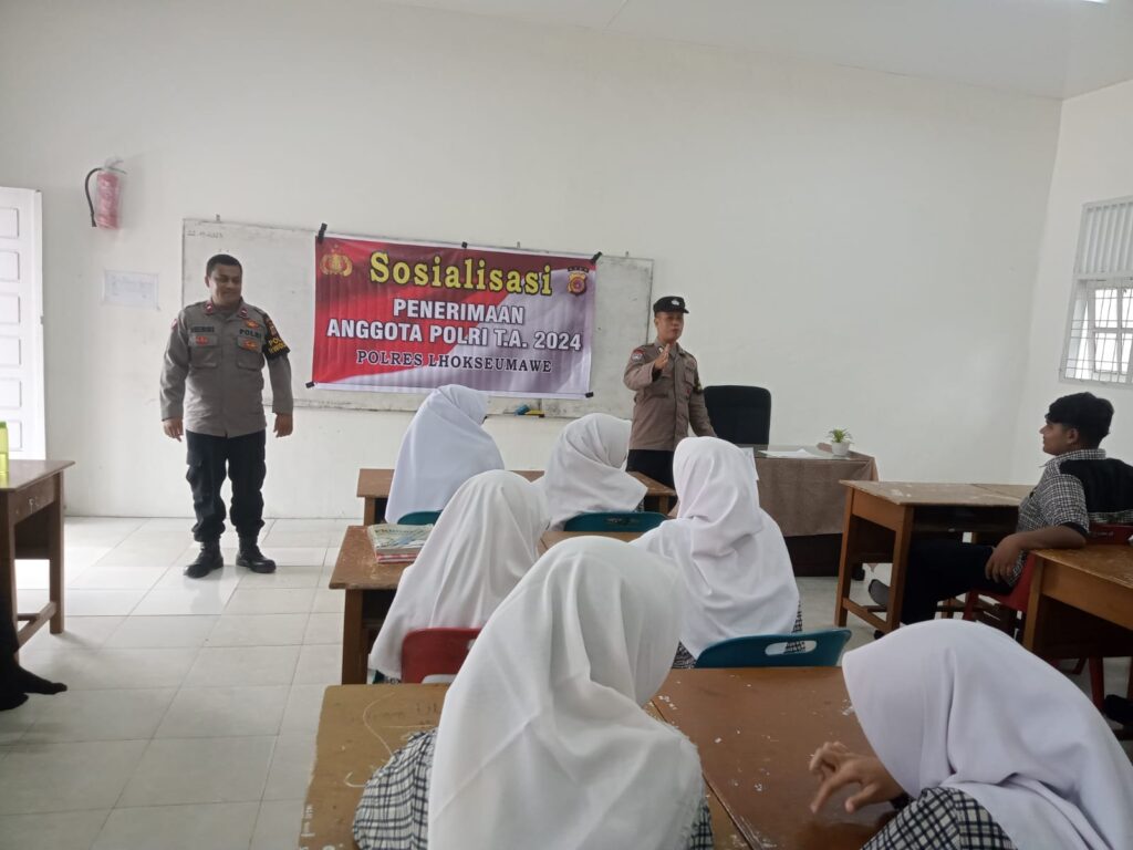 LHOKSEUMAWE – Personel Polsek Syamtalira Bayu melaksanakan sosialisasi tentang penerimaan calon anggota Polri TA 2024 kepada siswa – siswi Sekolah Menengah Atas (SMA) Negeri 1 Syamtalira Bayu, Aceh Utara, wilayah hukum Polres Lhokseumawe, Kamis (23/11/2023).