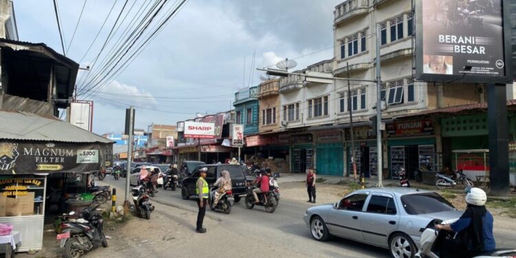 LHOKSEUMAWE – Personel Pos Pengamanan Ops Ketupat Seulawah 2023 Dewantara mengatur arus lalu lintas di Sp Empat Krueng Geukueh, Aceh Utara, wilayah hukum Polres Lhokseumawe, Kamis (27/4/2023).