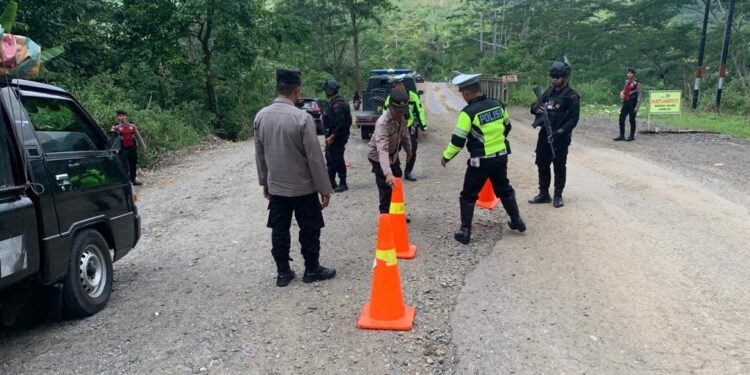 LHOKSEUMAWE – Personel Pos Pam Ops Ketupat Seulawah mengatur arus lalu lintas di jalur wisata Gunung Salak, Nisam Antara, Aceh Utara, wilayah hukum Polres Lhokseumawe, Senin (24/4/2023).