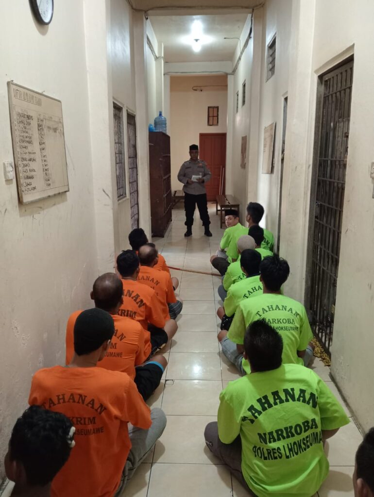 LHOKSEUMAWE – Personel Sat Tahti Polres Lhokseumawe memberikan bimbingan rohani dan mental (Binrohtal) rutin kepada para tahanan di Rutan Mapolres Lhokseumawe, Jumat (29/12/2023).