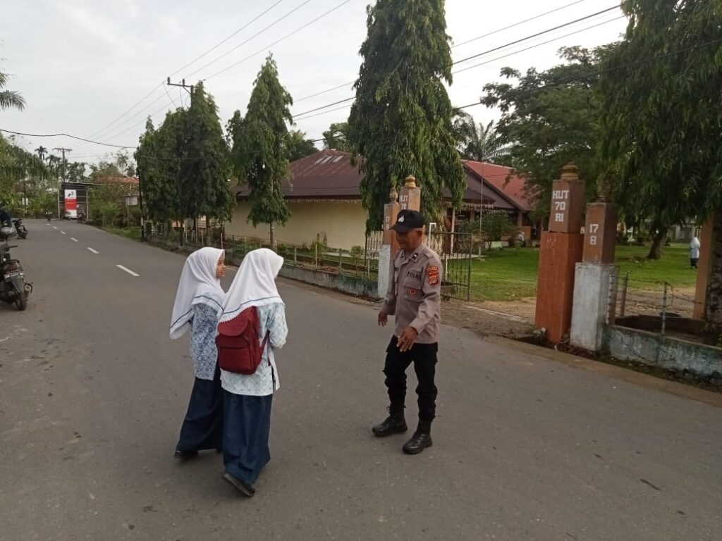 LHOKSEUMAWE – Personel Polsek Simpang Keuramat membantu siswa menyeberang jalan saat melaksanakan strong poin atau pengaturan lalu lintas di Kecamatan Simpang Keuramat, Aceh Utara, wilayah hukum Polres Lhokseumawe, Selasa (30/5/2023) pagi.