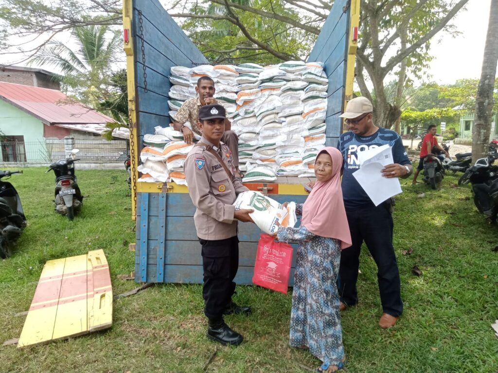 LHOKSEUMAWE – Personel Subsektor Banda Baro melakukan pengawalan penyaluran bantuan Beras Pangan (BP) Cadangan Beras Pemerintah (CBP) Tahap I tahun 2024 di kantor Camat Banda Baro, Aceh Utara, wilayah hukum Polres Lhokseumawe, Selasa (6/2/2024).