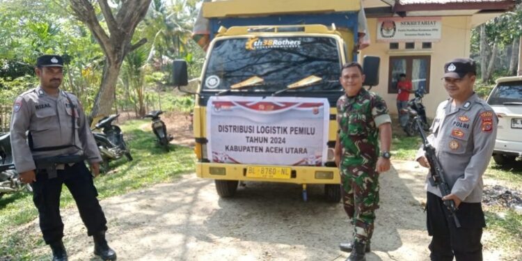 LHOKSEUMAWE – Personel Subsektor Banda Baro melakukan pengawalan dan pengamanan pada kegiatan serah terima logistik pemilu di kantor Sekretariat PPK Banda Baro, Aceh Utara, wilayah hukum Polres Lhokseumawe, Sabtu (10/2/2024).