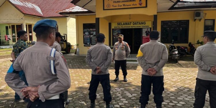 ACEH UTARA – Dalam suasana yang hening, Kapolsek Sawang IPTU Slamet Rezki memberikan arahan kepada seluruh personel yang hadir, menekankan pentingnya disiplin dalam melaksanakan tugas sehari-hari, rabu (17/4/2024).