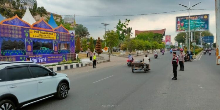 LHOKSEUMAWE – Polantas Lhokseumawe mengatur arus lalu lintas di depan pos pelayanan Ops Ketupat Seulawah 2023 Banda Sakti, Kota Lhokseumawe, Kamis (20/4/2023) sore.