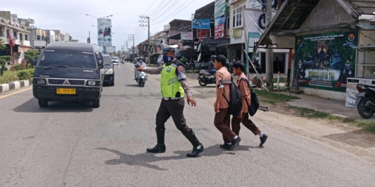 LHOKSEUMAWE – Polantas Lhokseumawe membantu pelajar menyeberang jalan, kegiatan tersebut dilakukan personel saat strong poin di titik penggal SMPN 7 Kota Lhokseumawe, Rabu (1/11/2023).