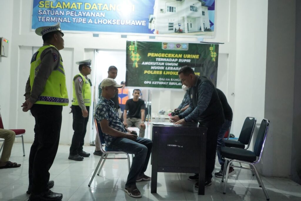 LHOKSEUMAWE – Satlantas Polres Lhokseumawe bersama tim gabungan kembali melakukan pemeriksaan urin terhadap pengemudi angkutan umum di terminal tipe A, Desa Meunasah Mee Kandang, Kecamatan Muara Dua, Kota Lhokseumawe, Senin (24/4/2023) malam.