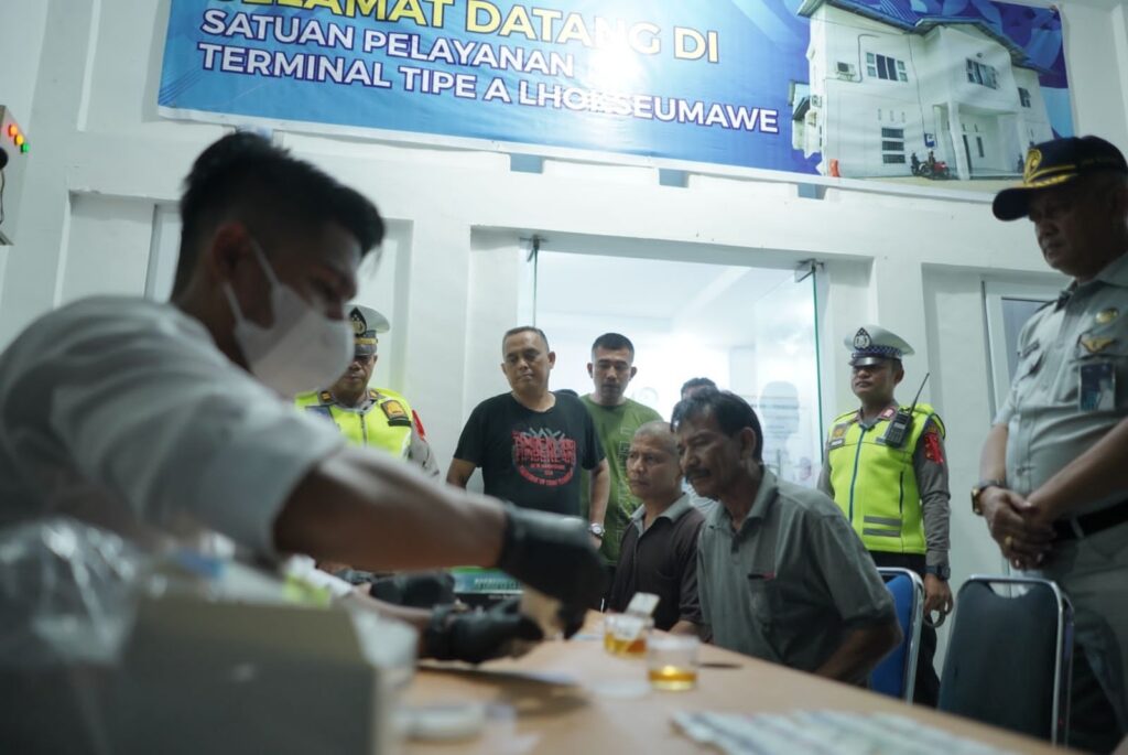 LHOKSEUMAWE – Satlantas Polres Lhokseumawe bersama tim gabungan melakukan pemeriksaan urin terhadap pengemudi angkutan umum di terminal tipe A, Desa Meunasah Mee Kandang, Kecamatan Muara Dua, Kota Lhokseumawe, Rabu (19/4/2023) malam.