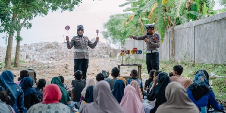 LHOKSEUMAWE – Polantas Lhokseumawe mengedukasi anak – anak di TPA Alue Lim, Kecamatan Blang Mangat, Kota Lhokseumawe tentang tertib berlalu lintas dan menjaga kebersihan lingkungan, Kamis (13/7/2023).