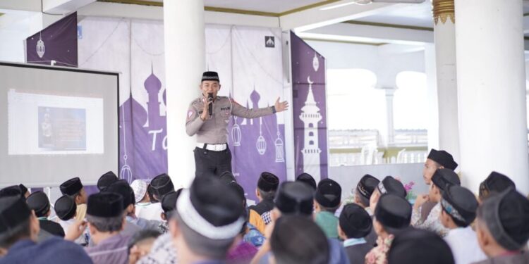LHOKSEUMAWE – Polantas Lhokseumawe mensosialisasikan tentang tertib berlalu lintas kepada para peserta Tadris Fi Ramadhan ke 8 di Masjid Al Mabrur, Meunasah Masjid, Kecamatan Muara Dua, Kota Lhokseumawe, Rabu (5/4/2023).