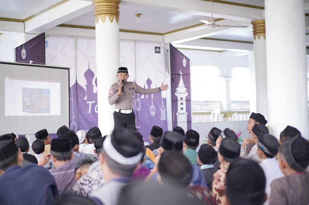 LHOKSEUMAWE – Polantas Lhokseumawe mensosialisasikan tentang tertib berlalu lintas kepada para peserta Tadris Fi Ramadhan ke 8 di Masjid Al Mabrur, Meunasah Masjid, Kecamatan Muara Dua, Kota Lhokseumawe, Rabu (5/4/2023).