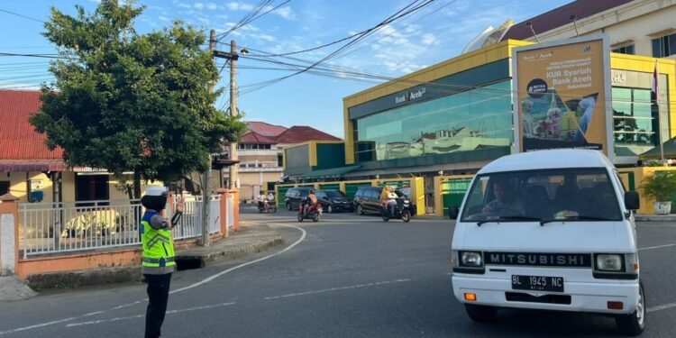 LHOKSEUMAWE – Polantas Lhokseumawe mengatur arus lalu lintas (strong poin) di sejumlah titik penggal dan rawan kecelakaan lalu lintas di wilayah Kota Lhokseumawe, Senin (29/5/2023) pagi.