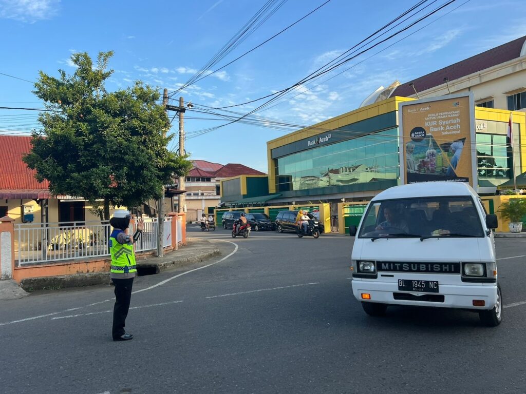 LHOKSEUMAWE – Polantas Lhokseumawe mengatur arus lalu lintas (strong poin) di sejumlah titik penggal dan rawan kecelakaan lalu lintas di wilayah Kota Lhokseumawe, Senin (29/5/2023) pagi.