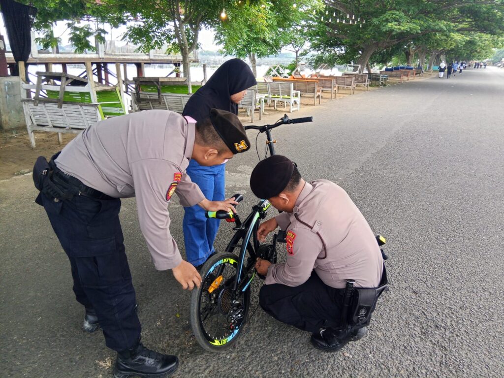 Lhokseumawe – Personel Sat Pamobvit Polres Lhokseumawe menunjukkan kepedulian di tengah tugas pengamanan Car Free Day (CFD) di Waduk Pusong, Minggu pagi (5/10/2025). Saat berpatroli, petugas membantu sekelompok anak-anak yang sepeda mereka putus rantai saat berolahraga.