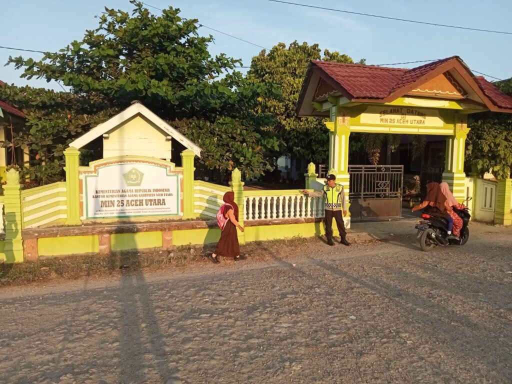 LHOKSEUMAWE – Personel Polsek Simpang Keuramat melakukan strong poin atau pengaturan lalu lintas di depan gerbang Madrasah Ibtidaiyah Negeri (MIN) Kecamatan Simpang Keuramat, Aceh Utara, wilayah hukum Polres Lhokseumawe, rabu (12/6/2024) pagi.