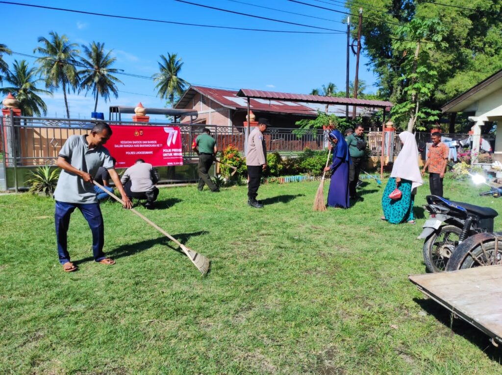 LHOKSEUMAWE – Personel Polsek Meurah Mulia melaksanakan gotong royong (kurve) membersihkan pekarangan masjid di Kecamatan Meurah Mulia, Aceh Utara, wilayah hukum Polres Lhokseumawe, Senin (19/6/2023).