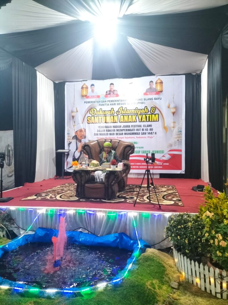 Aceh Utara – Ribuan jamaah memadati acara Dakwah Islamiah yang digelar di Desa Blang Bayu, Kecamatan Syamtalira Bayu, Kabupaten Aceh Utara, Sabtu (30/8/2025) malam. Kegiatan ini berlangsung dalam rangka memperingati Maulid Nabi Muhammad SAW 1447 H, sekaligus diisi dengan santunan anak yatim piatu dan pembagian hadiah Festival Islami menyambut HUT RI ke-80.