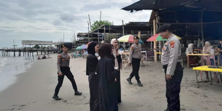 Lhokseumawe — Mentari pagi baru saja memancarkan sinarnya di Pantai Ujung Blang, Lhokseumawe. Suara deburan ombak bersahut-sahutan dengan keceriaan anak-anak yang bermain di bibir pantai. Di tengah suasana santai para wisatawan, tampak beberapa personel polisi berjaga, menyapa ramah pengunjung yang datang.