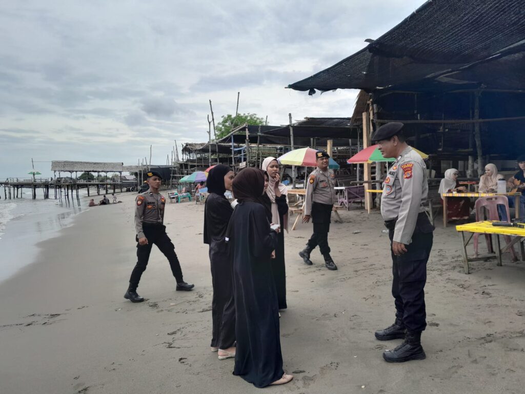 Lhokseumawe — Mentari pagi baru saja memancarkan sinarnya di Pantai Ujung Blang, Lhokseumawe. Suara deburan ombak bersahut-sahutan dengan keceriaan anak-anak yang bermain di bibir pantai. Di tengah suasana santai para wisatawan, tampak beberapa personel polisi berjaga, menyapa ramah pengunjung yang datang.