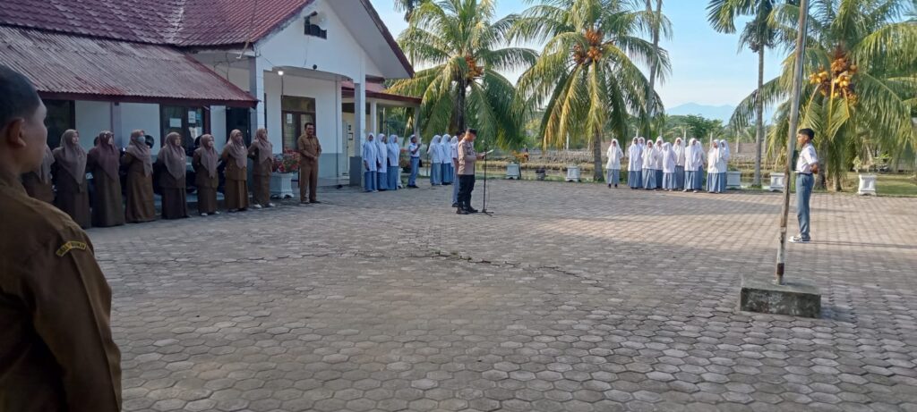 Aceh Utara – Dalam rangka mempererat hubungan dengan dunia pendidikan sekaligus menanamkan nilai-nilai disiplin sejak dini, Kanit Binmas Polsek Muara Batu, Aiptu Akbari, bertindak sebagai pembina upacara bendera di SMA Negeri 2 Kesuma Bangsa, Desa Bungkah, Kecamatan Muara Batu, Kabupaten Aceh Utara, Senin pagi (6/10/2025).