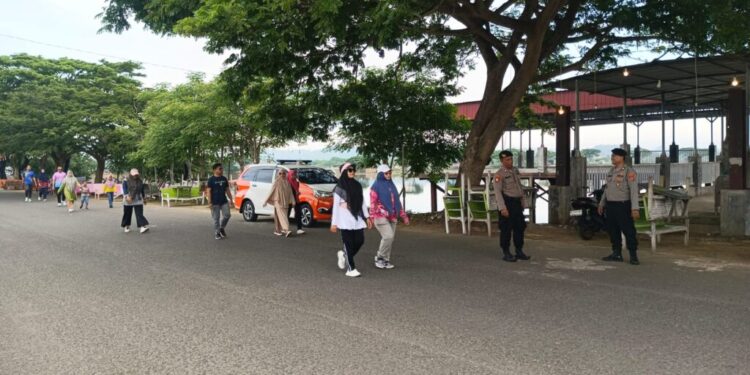 Lhokseumawe – Suasana akhir pekan di Waduk Pusong, Kecamatan Banda Sakti, Kota Lhokseumawe, tampak lebih aman dengan kehadiran personel Sat Pamobvit Polres Lhokseumawe yang melakukan patroli dan pengamanan, Minggu pagi (14/9/2025).
