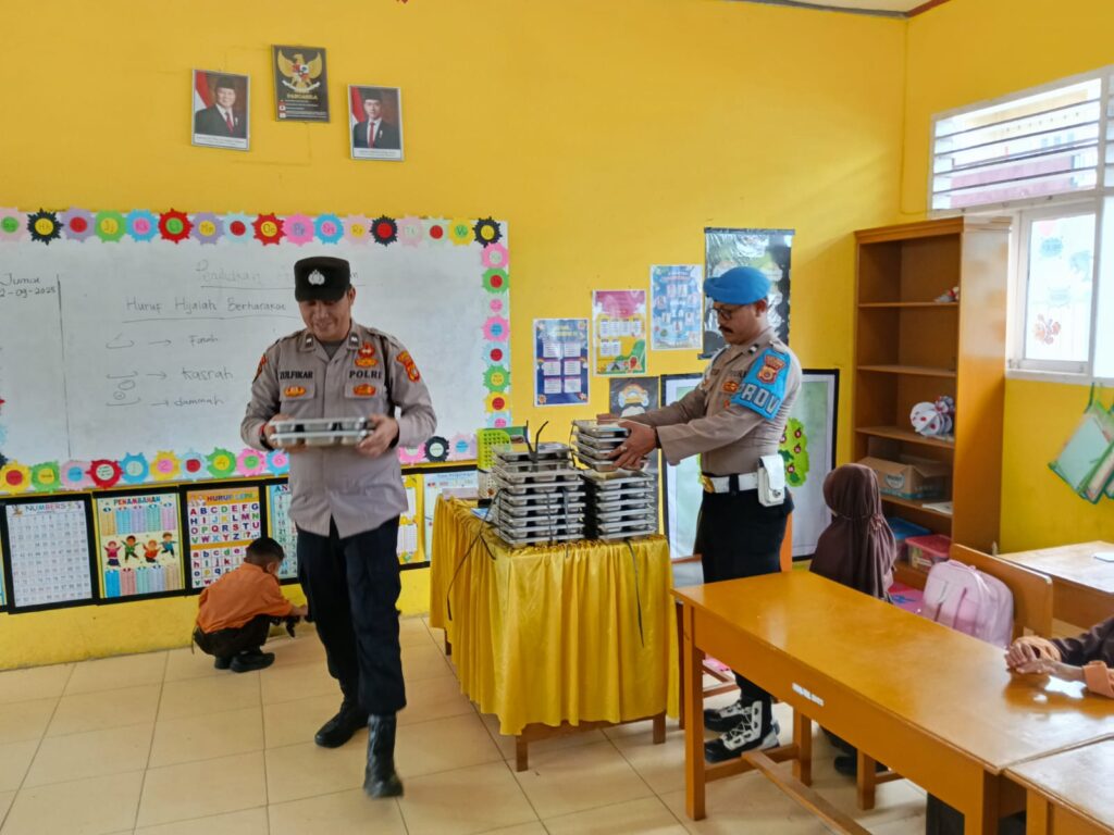 Aceh Utara – Personel kepolisian turut mengawal jalannya pembagian 2.605 paket Makan Bergizi Gratis (MBG) dari Badan Gizi Nasional (BGN) kepada siswa-siswi di Kecamatan Dewantara, Kabupaten Aceh Utara, Jumat (12/09/2025). Kehadiran polisi bertujuan memastikan distribusi berjalan aman, tertib, dan lancar.