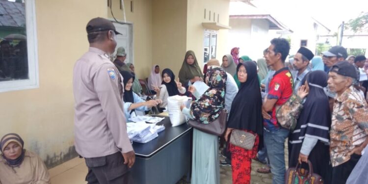 LHOKSEUMAWE – Personel Polsek Simpang Keuramat mengawal penyaluran bantuan pangan untuk masyarakat di halaman kantor Camat Simpang Keuramat, Aceh Utara, wilayah hukum Polres Lhokseumawe, Kamis (16/11/2023).