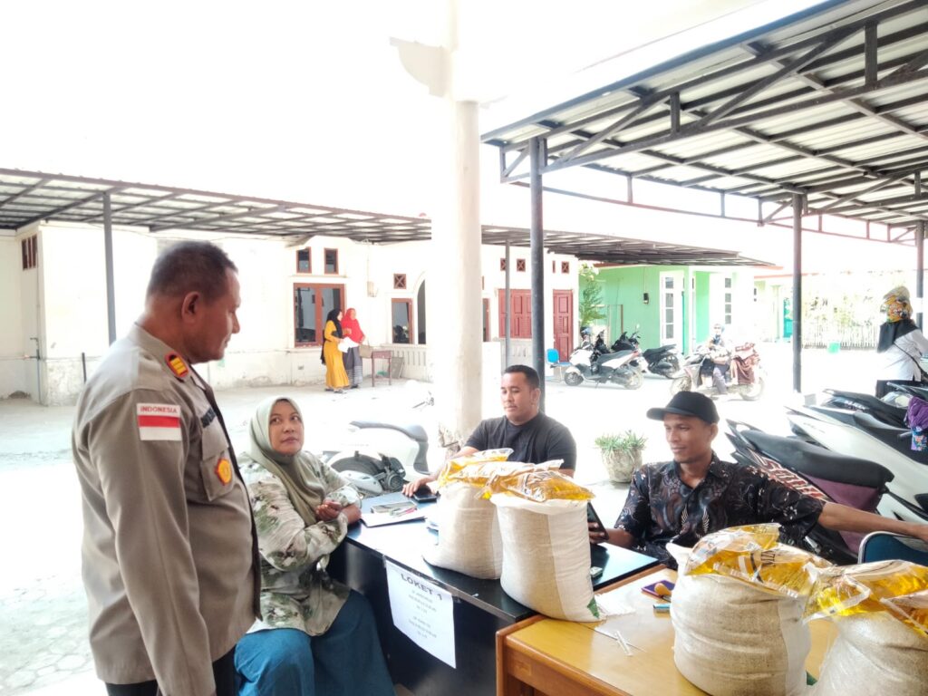 Lhokseumawe – Personel kepolisian melakukan pengawalan kegiatan penyaluran bantuan pemerintah berupa beras dan minyak goreng bagi masyarakat Kecamatan Blang Mangat, Kota Lhokseumawe, Rabu (22/4/2026) pagi.