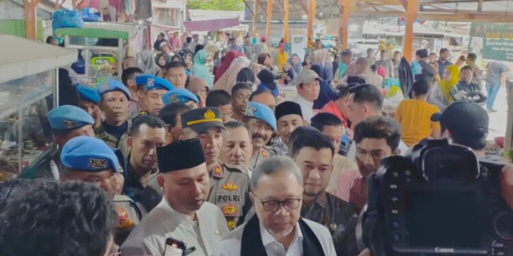 LHOKSEUMAWE – Personel gabungan Polres Lhokseumawe melakukan pengamanan kunjungan Menteri Perdagangan RI, Zulkifli Hasan ke pasar tradisional Batuphat, Kecamatan Muara Satu, Kota Lhokseumawe, Jumat (15/12/2023).