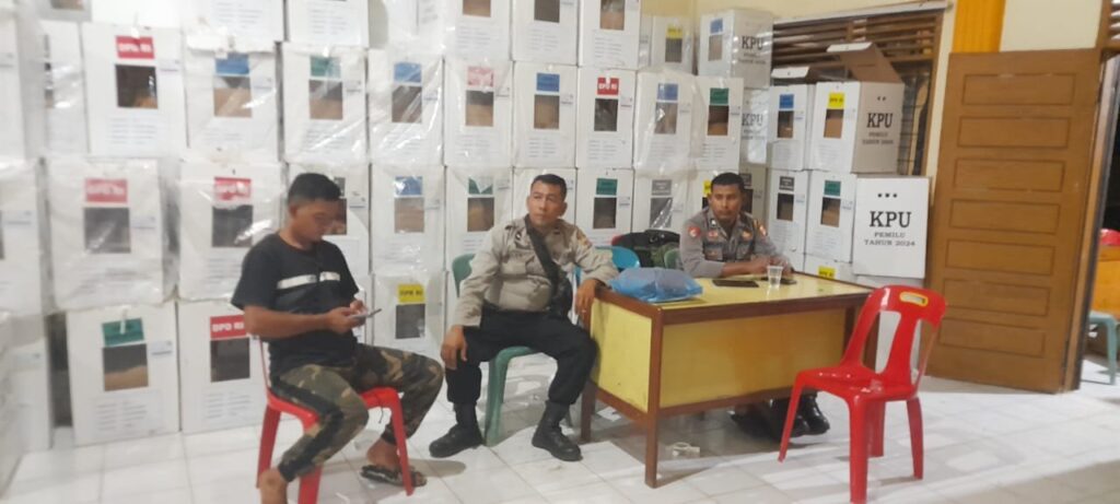 LHOKSEUMAWE – Personel Polsek Kuta Makmur dan BKO Polres Lhokseumawe melakukan pengamanan rapat pleno rekapitulasi hasil penghitungan suara Pemilu 2024 di kantor camat Kuta Makmur, Aceh Utara, wilayah hukum Polres Lhokseumawe, Minggu (18/2/2024).
