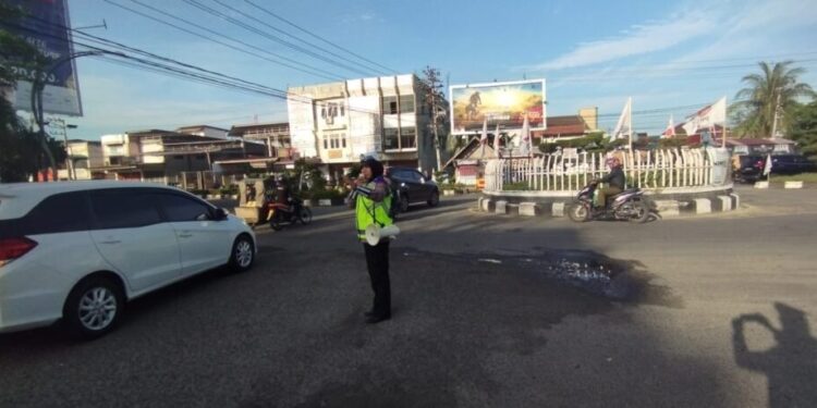 LHOKSEUMAWE – Polantas Lhokseumawe memberikan edukasi tentang tertib lalu lintas dan keselamatan di jalan raya kepada masyarakat, kegiatan tersebut dilaksanakan melalui program Polisi Meupep – pep di Simpang Lantas, Cunda, Muara Dua, Kota Lhokseumawe, Jumat (26/5/2023).