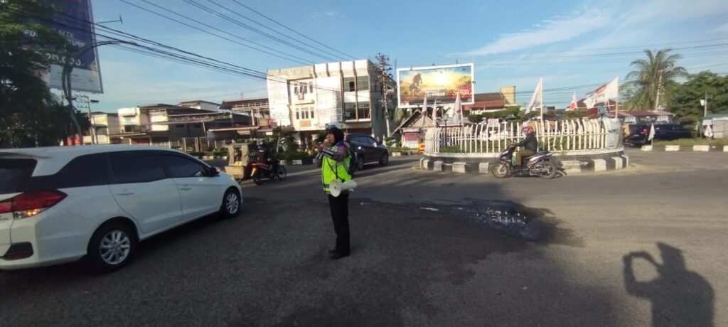 LHOKSEUMAWE – Polantas Lhokseumawe memberikan edukasi tentang tertib lalu lintas dan keselamatan di jalan raya kepada masyarakat, kegiatan tersebut dilaksanakan melalui program Polisi Meupep – pep di Simpang Lantas, Cunda, Muara Dua, Kota Lhokseumawe, Jumat (26/5/2023).
