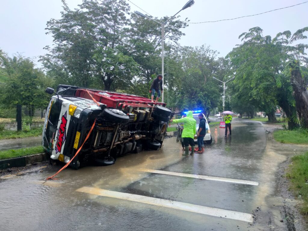LHOKSEUMAWE – Satu unit truk enam roda (KR 6) terbalik di ruas Jalan Medan–Banda Aceh, tepatnya di depan PJB Desa Meuria Paloh, Kecamatan Muara Satu, Lhokseumawe, sekitar pukul 09.00 WIB, Selasa pagi (25/11/2025). Kondisi hujan deras, jalan licin, serta adanya lubang besar di badan jalan diduga menjadi penyebab kecelakaan tunggal tersebut. Personel Polres Lhokseumawe melalui Polsek Muara Satu bergerak cepat menuju lokasi untuk melakukan penanganan dan pengamanan arus lalu lintas.