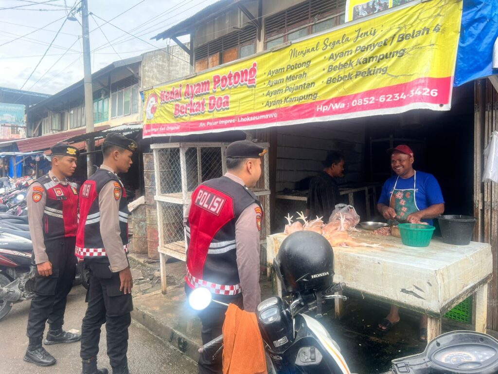 Lhokseumawe – Suasana pasar tradisional di Kota Lhokseumawe tampak lebih tertib dan aman. Hal ini berkat kehadiran personel Polres Lhokseumawe yang melaksanakan patroli rutin guna memastikan keamanan masyarakat, Sabtu pagi (13/9/2025).