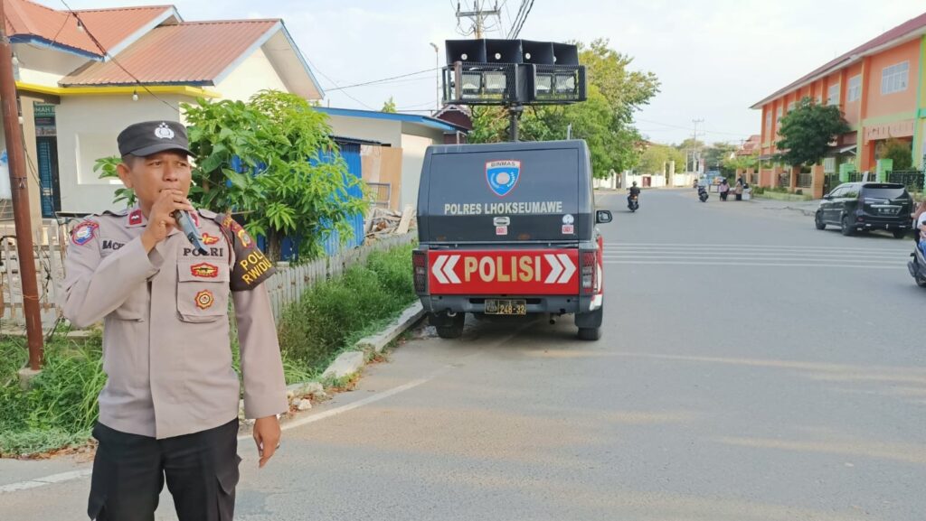 LHOKSEUMAWE – Polres Lhokseumawe sampaikan himbauan kamtibmas Jelang berbuka puasa Ramadhan 1445 Hijriah dengan menggunakan mobil Public Address di lokasi keramaian dan pusat pasar Kota Lhokseumawe, sabtu (16/3/2024) sore.