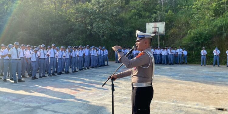 Lhokseumawe – Unit Kamsel Satlantas Polres Lhokseumawe kembali melaksanakan program Polisi Saweu Sikula di SMK Negeri 7 Lhokseumawe. Kegiatan yang digelar di lapangan upacara sekolah tersebut, Senin (19/1/2025) pagi.