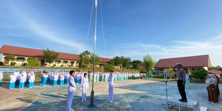 Lhokseumawe — Satlantas Polres Lhokseumawe melaksanakan kegiatan Polisi Saweu Sikula dengan menjadi pembina upacara Senin pagi di SMK Negeri 8 Lhokseumawe, Senin (28/7/2025) pagi.